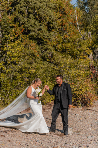 We met up with their incredible officiant, Raul Rodriguez of Best Day Officiants and got the ceremony started. At the point where Lake McDonald flows into McDonald cree—with the trees with the sounds of the park all around, they shared vows, laughs, and happy tears in one of the most peaceful corners of Glacier. It was simple and perfect.